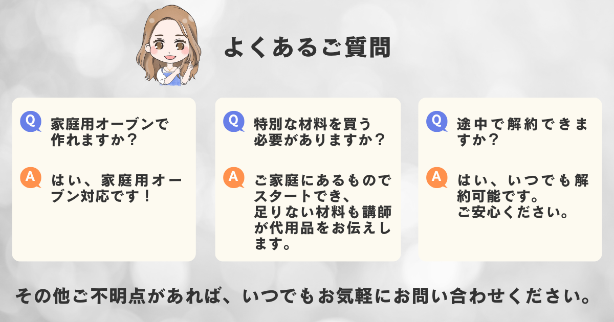 A. いいえ、基本的にはご家庭にあるもので始められますし、もし手元にない場合でも講師が代用できる材料をお伝えしますので安心です。